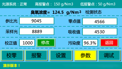 臭氧分析儀帶有觸摸屏操作界面,實時顯示臭氧氣體的濃度,帶有壓力和溫度補償及顯示,可設置自動校零時間和手動校零模式。高濃度(g/Nm3)量程帶有流量輸入功能,可實時顯示臭氧發(fā)生器的產(chǎn)量。帶有兩組繼電器信號輸出,用戶可自由選擇高報警點和低報警點信號輸出連接。核心部件采用紫外長壽命光源系統(tǒng),采用高透光率石英片,保證零點的穩(wěn)定性,防止零點漂移影響檢測濃度的準確性。根據(jù)國外光池技術設計的耐壓力,耐沖擊的獨立光池結構,校零操作時氣體流量、壓力、流速保持不變,防止氣流沖擊對校零產(chǎn)生影響,無需關閉臭氧進氣可完成校零操作,保證設備可以每天24小時連續(xù)運行。